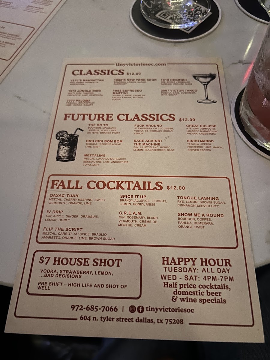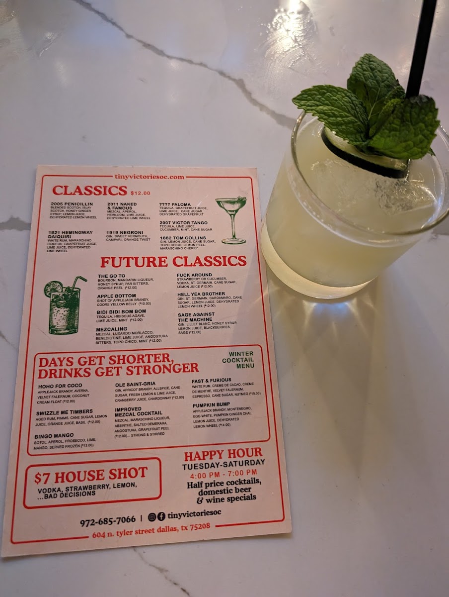 Welcome to Tiny Victories, a hidden gem located at 604 N Tyler St, Dallas, TX. This cozy spot is perfect for anyone seeking a relaxed atmosphere coupled with exceptional drinks. Customers rave about the freshness of ingredients, with every cocktail showcasing vibrant flavors and impressive presentations.